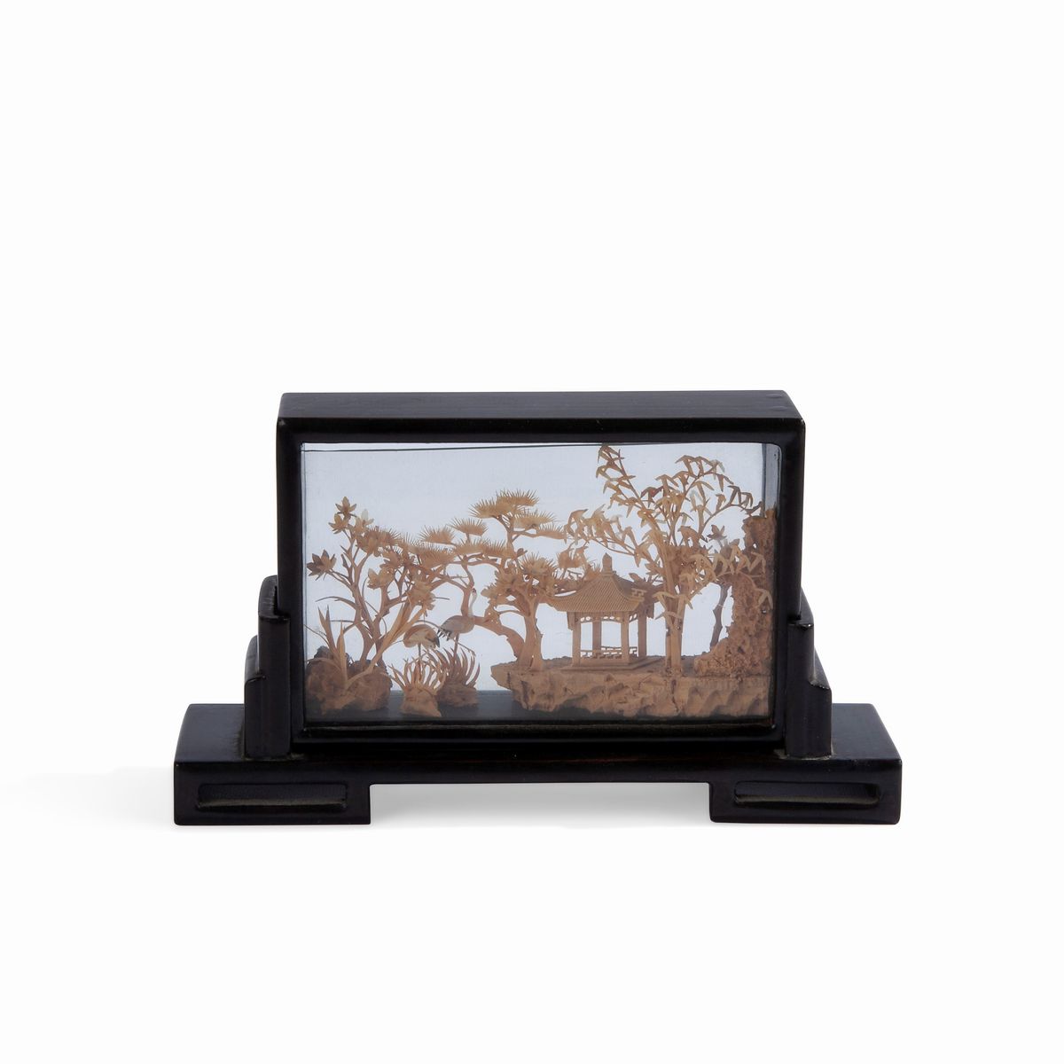 Diorama in sughero minuziosamente intagliato, Cina, metà del XX secolo