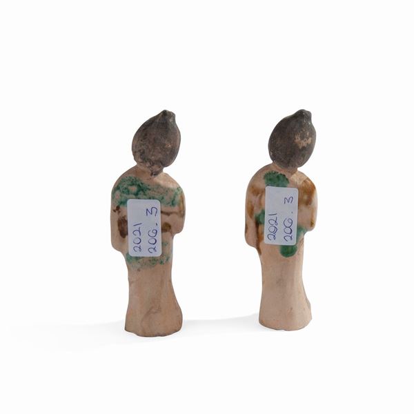 Due piccole antiche figure di Guan Yin di gusto Tang in terracotta parzialmente invetriata, Cina