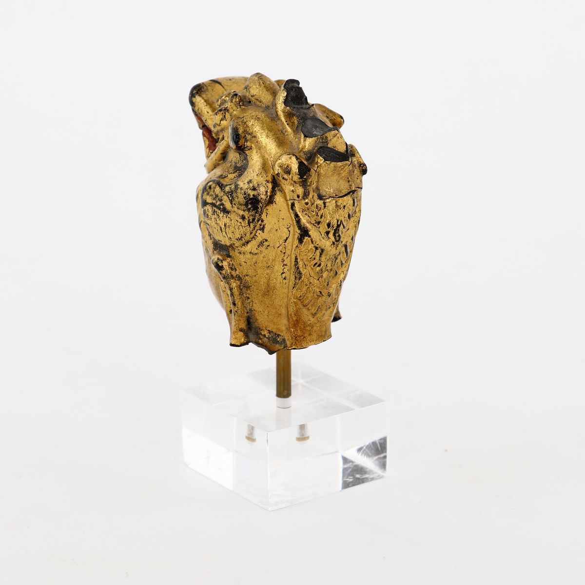Piccola testa di Buddha in pietra arenaria laccata e dorata, Birmania (?)
