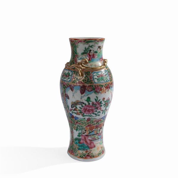 Vasetto a balaustro in porcellana policroma, Canton fine del XIX secolo