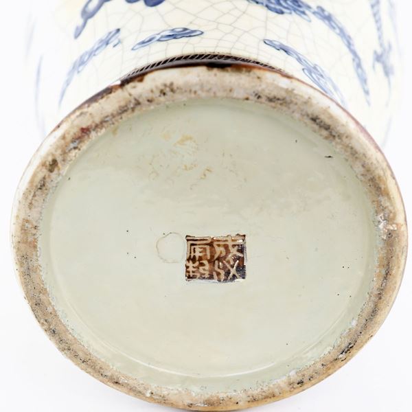 decorato in blu su fondo craquelé con draghi affrontati; due fasce brunite con fitta ornamentazione in bassorilievo definiscono la base e il collo