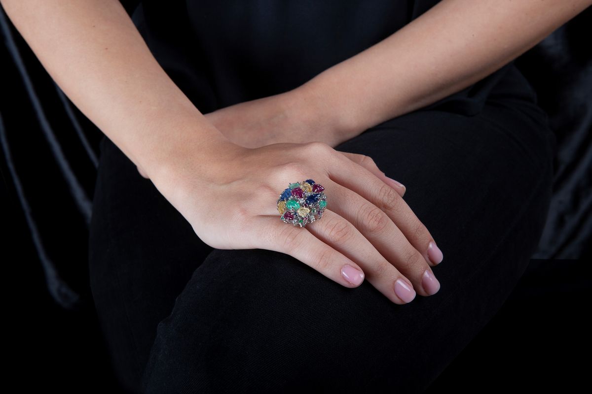 Oro bianco 750/000. Smeraldi, rubini, zaffiri blu e gialli incisi ct 12 ca. Brillanti ct. 0,35 ca. Peso complessivo gr. 12,40.
