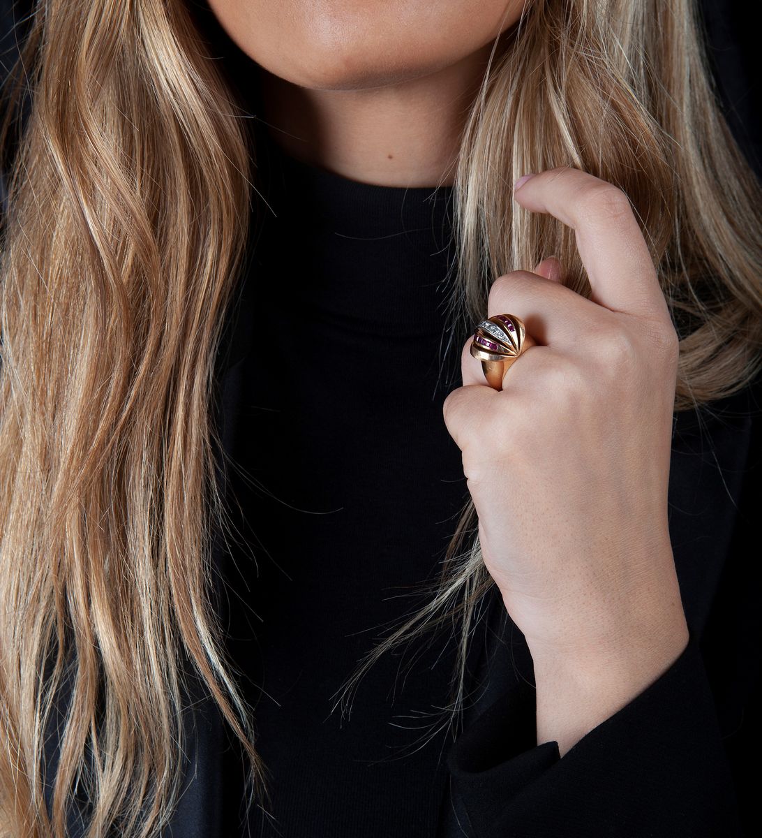 Anello degli anni '40 in oro giallo brillanti e rubini