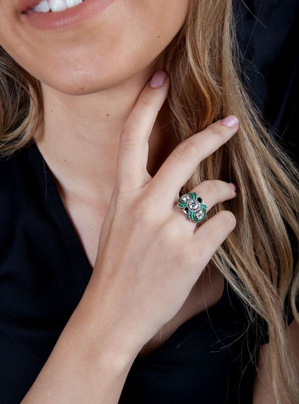 Platino 950/000, tre diamanti centrali in taglio rotondo ct. 2 ca, H-I - SI-P ,smeraldi e onici in taglio calibrè. Peso complessivo gr 6,60.