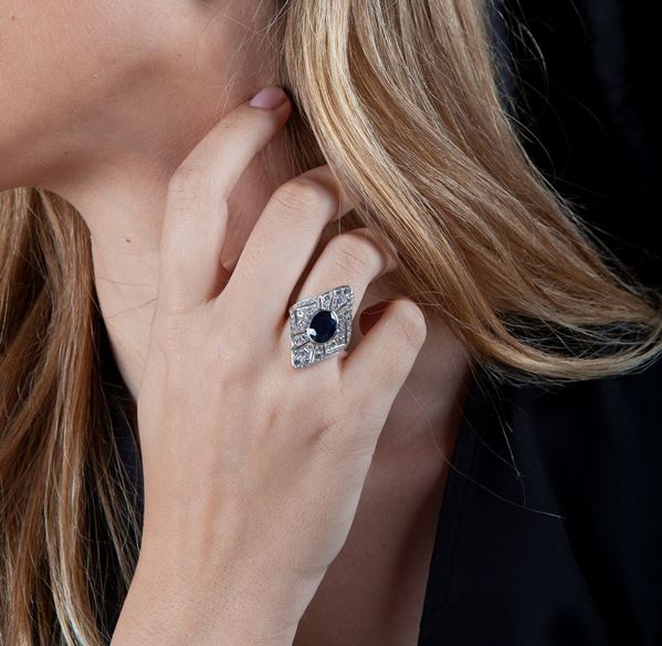 Oro giallo e bianco 750/000, zaffiro centrale taglio ovale ct.2 ca. diamanti in taglio rotondo brillante ct.1,60 ca. Peso complessivo gr 6.