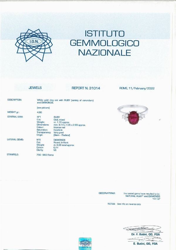 Oro bianco 750/000. Rubino naturale in taglio ovale ct. 1,70, brillanti ct. 0,36 G/H,VS. Corredato di certificazione gemmologica.