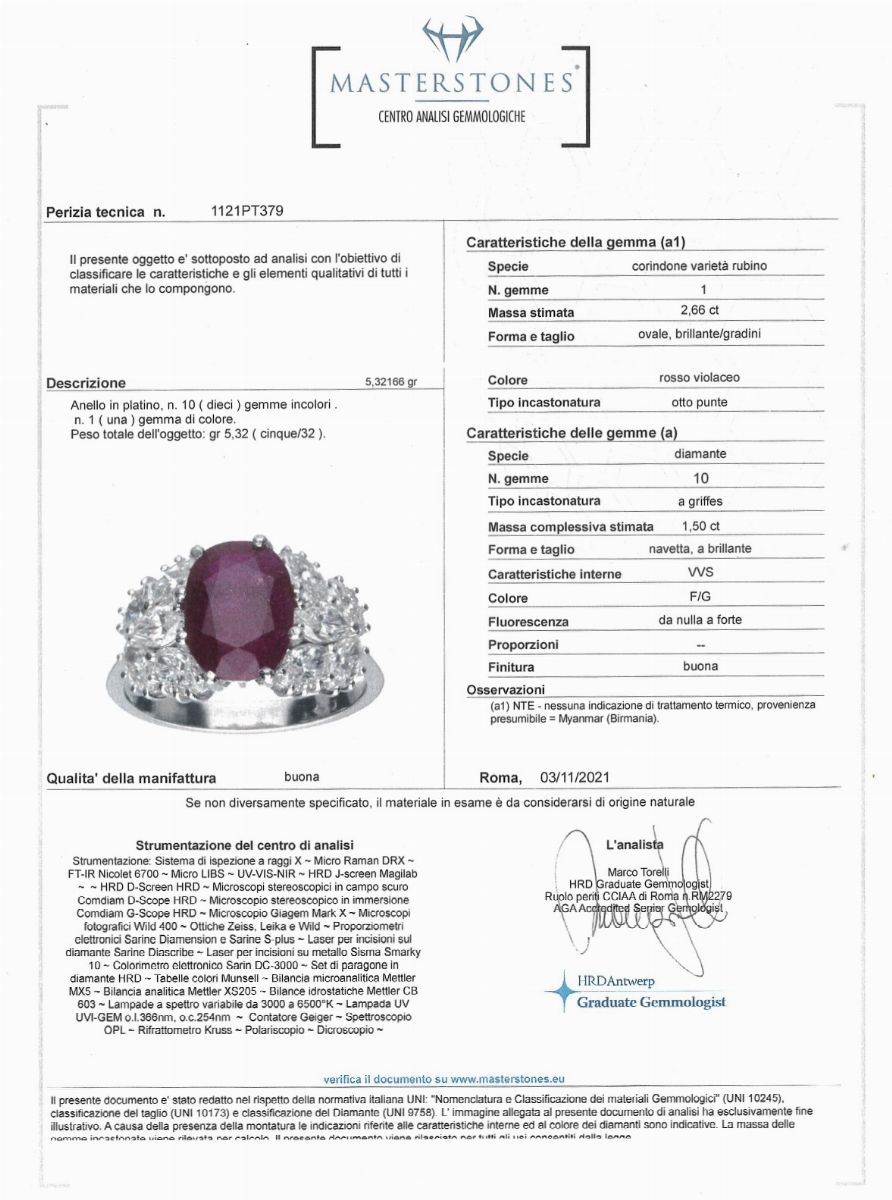 Oro bianco 750/000. Rubino naturale in taglio ovale senza indicazione di trattamento termico, Myanmar. Diamanti in taglio brillante forma navette, ct. 2,50 - F,G-VVS, peso complessivo gr. 5,30. Corredato di certificazione gemmologica.