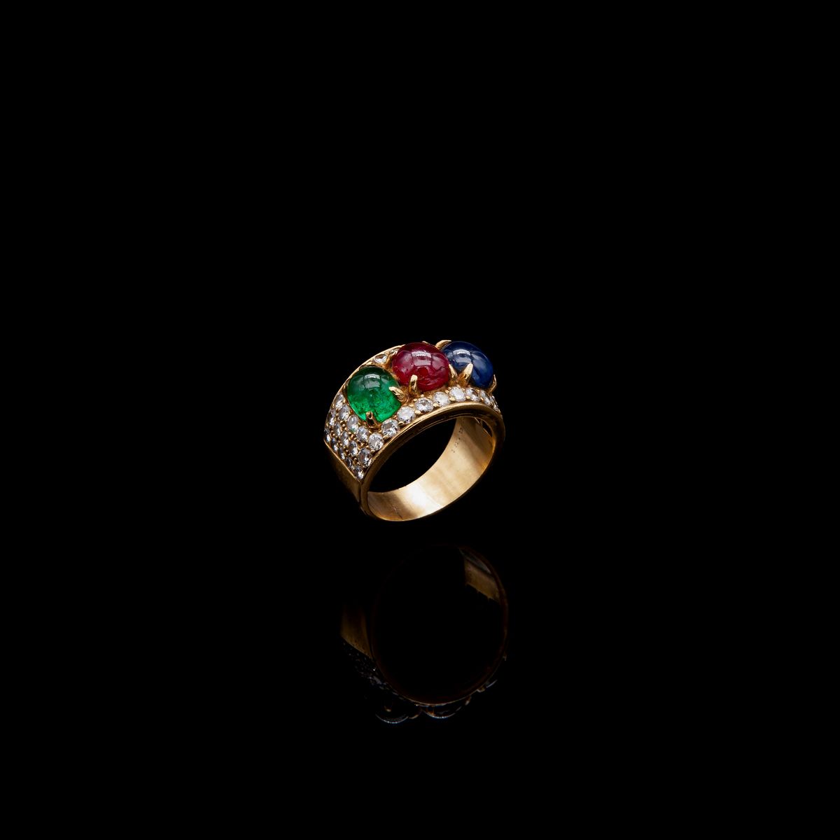Oro giallo 750/000. Zaffiro naturale in taglio cabochon ct 1,50 ca; rubino naturale in taglio cabochon ct. 1,50 ca.; smeraldo naturale in taglio cabochon ct. 1,30 ca. Brillanti ct, 1,00 ca. Peso complessivo gr. 11,10.