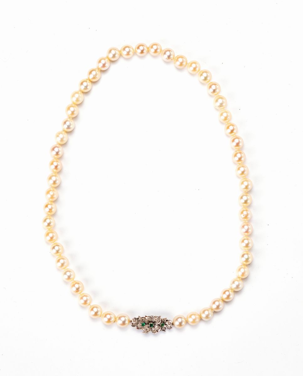 Collana di perle giapponesi con chiusura in oro diamanti e smeraldi