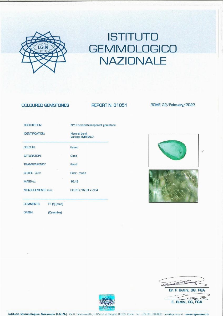 Smeraldo naturale Colombiano, ct. 16,43. Corredato di certificazione gemmologica.