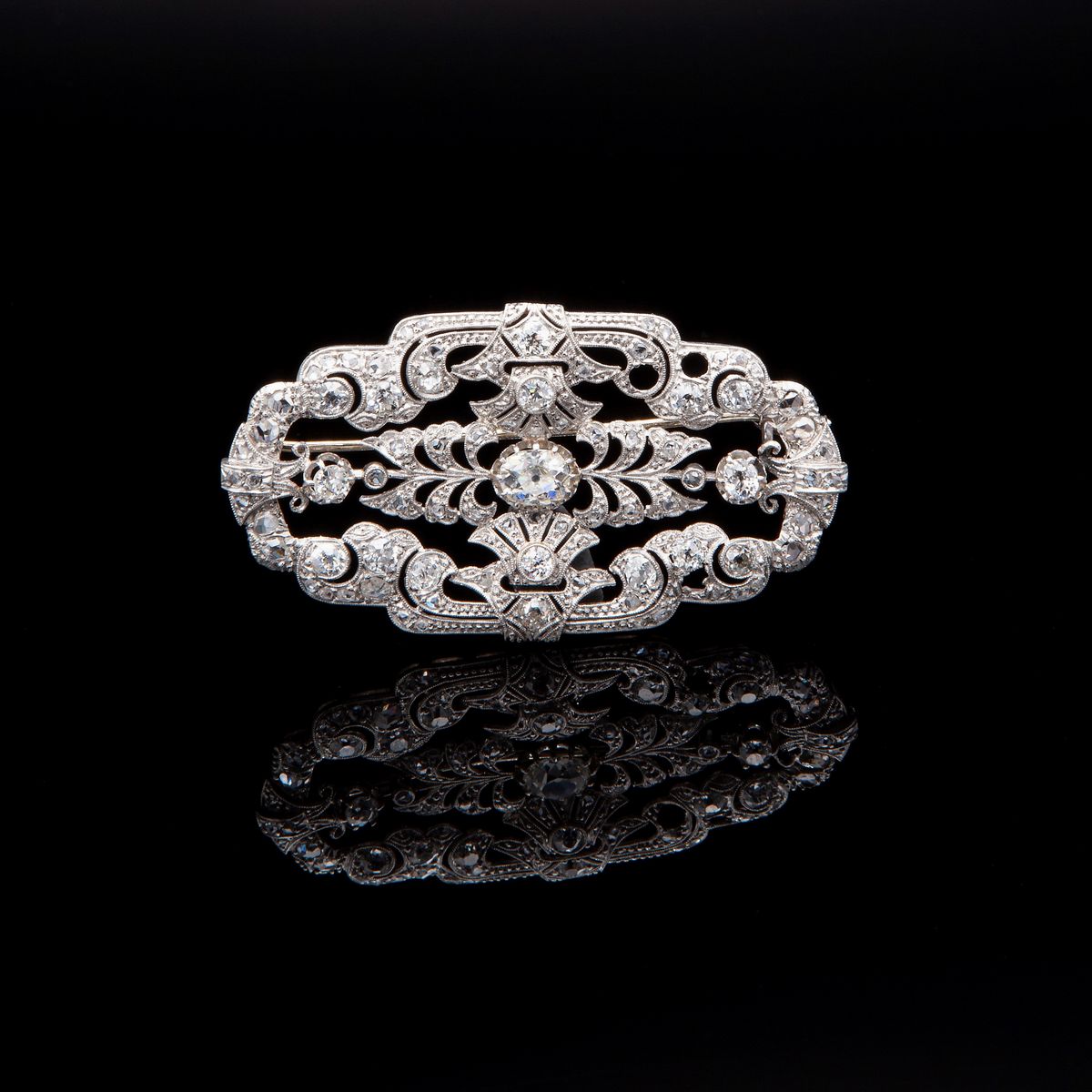 Spilla 1920/1930, oro bianco 750/000. Diamanti in taglio vecchia Europa, ct 2,80 ca. Mancanza di tre brillanti. Peso complessivo gr 13,20.