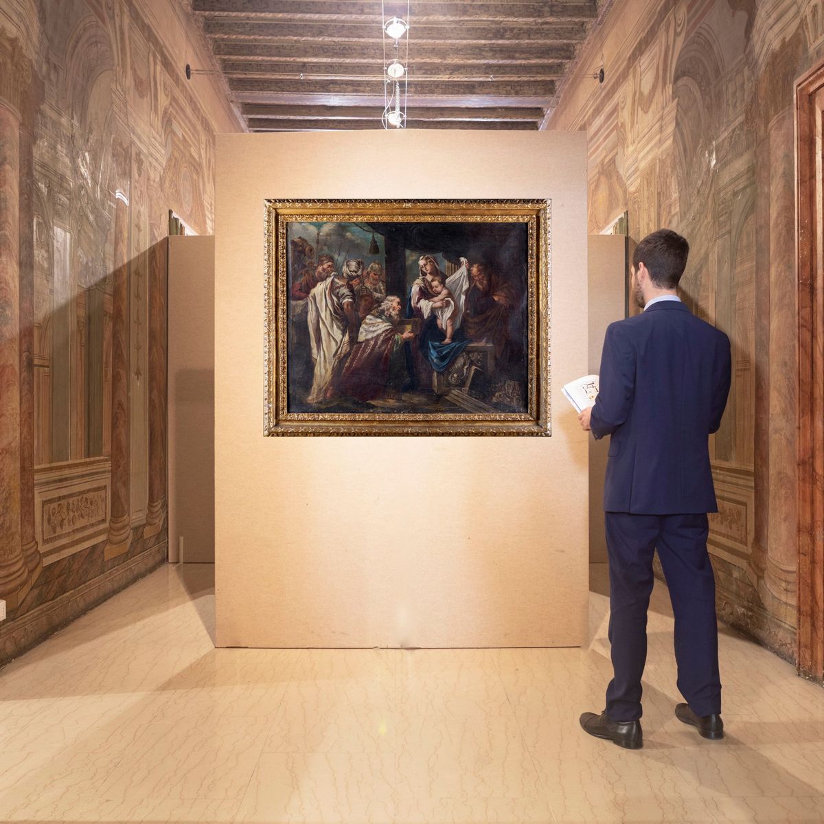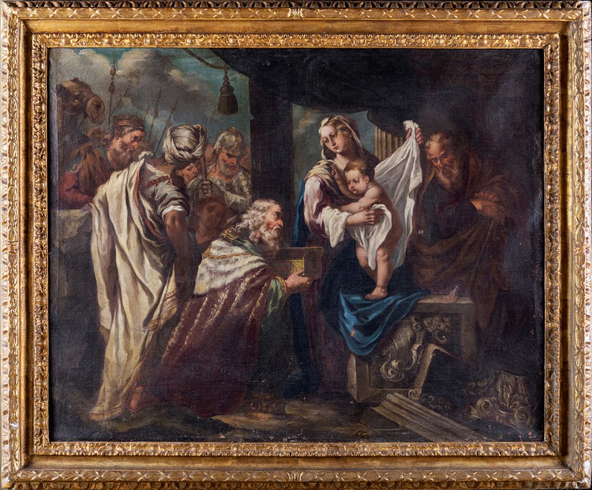 La tela raffigura, secondo una composizione particolarmente elaborata e un effetto di grande sontuosità, un' Adorazione dei Magi. Il dipinto mostra una certa vicinanza ad alcune produzioni riconducibili al pittore napoletano Francesco Solimena e ai suoi allievi, dove possiamo riscontrare una simile volontà di traduzione dell'episodio evangelico nei termini di una visione fastosa e magniloquente. Anche la consistenza della materia pittorica, gli accordi cromatici e la pennellata sembrano suggerire la derivazione napoletana della tela. L'opera è accompagnata da una cornice antica in legno intagliato e dorato.