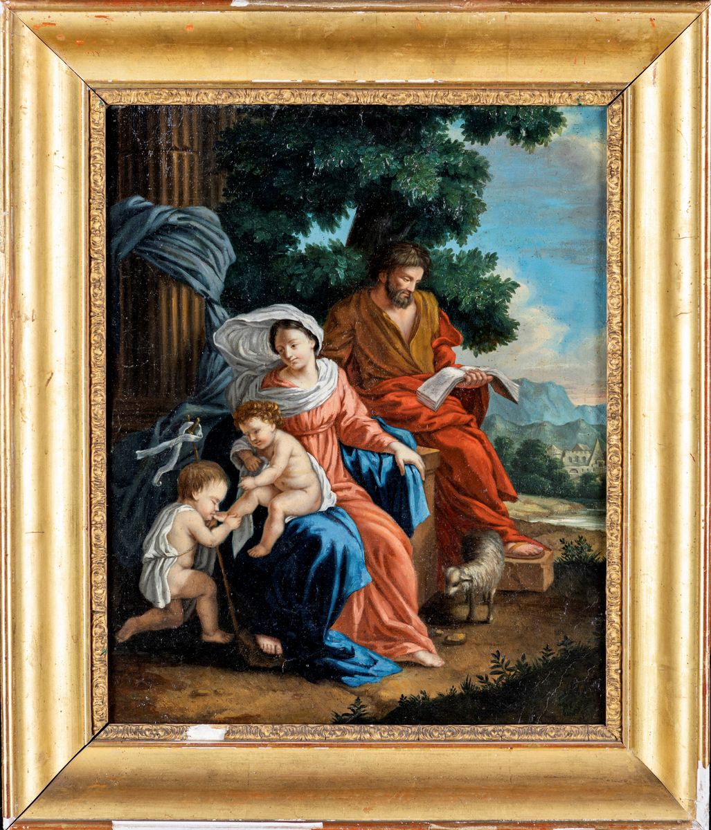 I personaggi sono colti in un momento di spensierata intimità e la scena è ambientata all'aperto, sotto l'ombra di un frondoso albero e nei pressi di una colonna scanalata. La fluente pennellata e la scelta della composizione rimandano a un pittore di ambito romano, formato sull'esempio delle opere di Pietro da Cortona.
