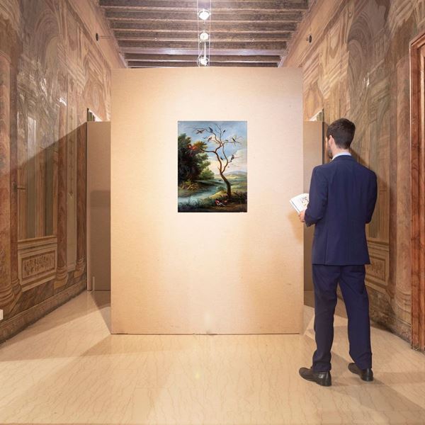 Curioso paesaggio fluviale con colline sullo sfondo e un albero con svariate tipologie di specie di volatili. La perizia rispetto alla rappresentazione delle diverse famiglie di volatili e l'intento tassonomico della rappresentazione – con l'albero pensato per esporre le varie specie, secondo un intendimento a metà tra la wunderkkammer e lo specimen – lascia supporre l'attività di un pittore fiammingo, ipoteticamente entrato in contatto con certe produzioni toscane a cavallo tra XVII e il XVIII secolo e in cui, contestualmente alla ricerca più propriamente artistica circa la raffigurazione del paesaggio, compare una volontà di ricerca pseudo-scientifica rispetto allo studio di specie animali o vegetali.