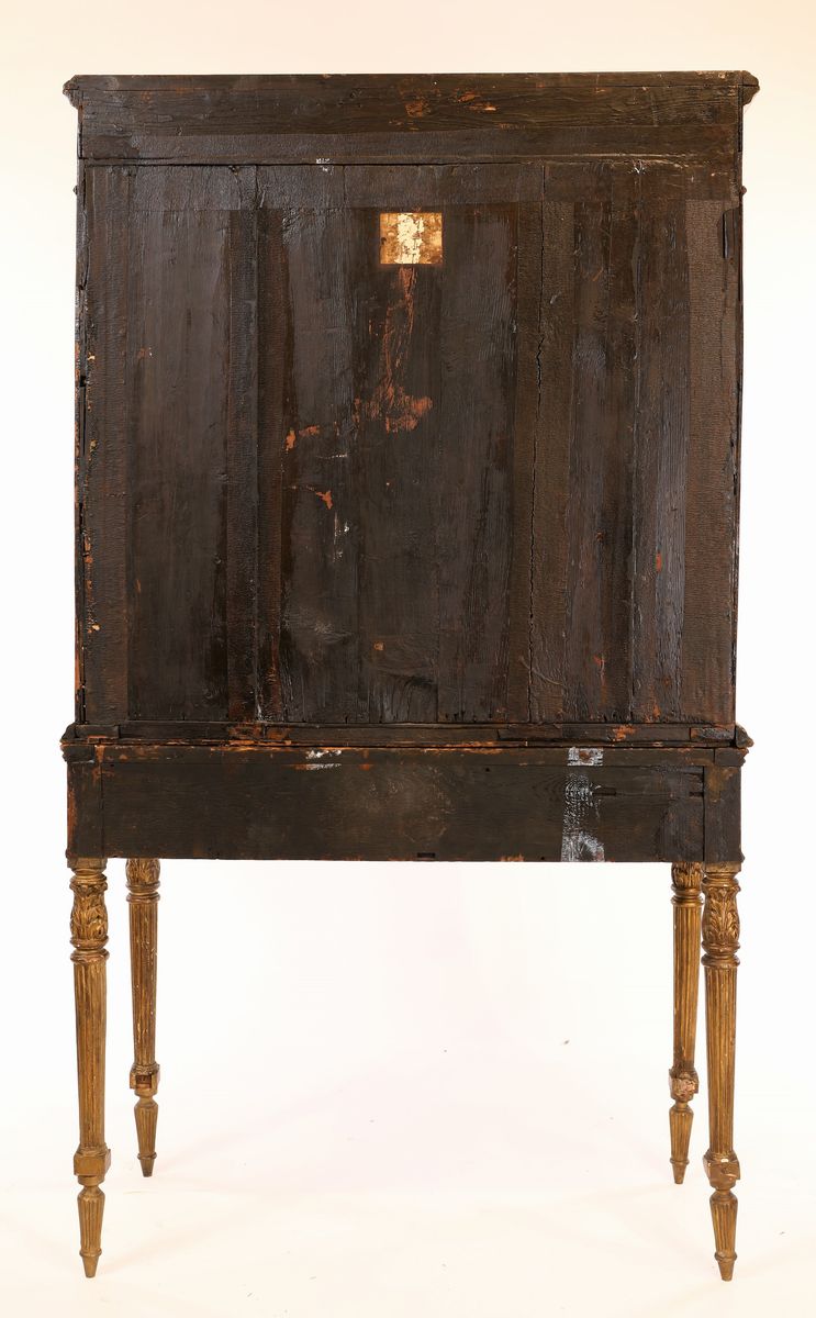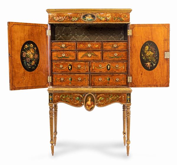 decorato in vivace policromia con miniature di gusto classico, ghirlande fiorite e medaglioni; le due ante frontali recano esternamente vedute bucoliche con architetture e personaggi racchiusi da cornici a nastro ritorto intervallato da perline, al verso vasi con composizioni floreali entro nicchie, motivo decorativo ripreso su entrambe i fianchi; all'interno un ripiano e dieci tiretti di diversa misura, ognuno caratterizzato da motivi vegetali, strumenti musicali ed elementi desunti dal repertorio classico. Base con fascia dal profilo curvilineo sottolineato da perlinatura dorata, centrata da medaglione con ritratto muliebre racchiuso da cornice intagliata a nastro; gambe rastremate scanalate