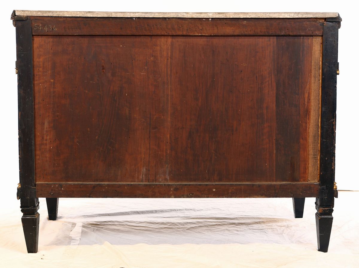 con filettature e delicati intarsi in pastiglia caratteristici del gusto neoclassico in forma di raffaellesche con candelabre, vasi e minute ghirlande di perline; piano rettangolare incassato in marmo grigio racchiuso da cornice percorsa da palmette, un cassetto nella fascia e tre sottostanti privi di traversa delimitati da colonne ioniche angolari con fusto scanalato, di cui il cassetto centrale, di maggiore ampiezza, reca un sole racchiuso in una losanga da cui si dipartono motivi naturalistici e ghirlande che si diramano intorno alle maniglie; piedi ad obelisco