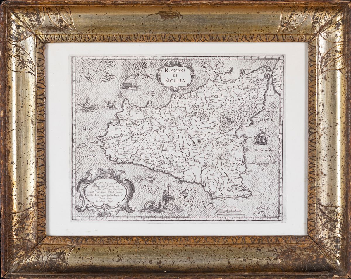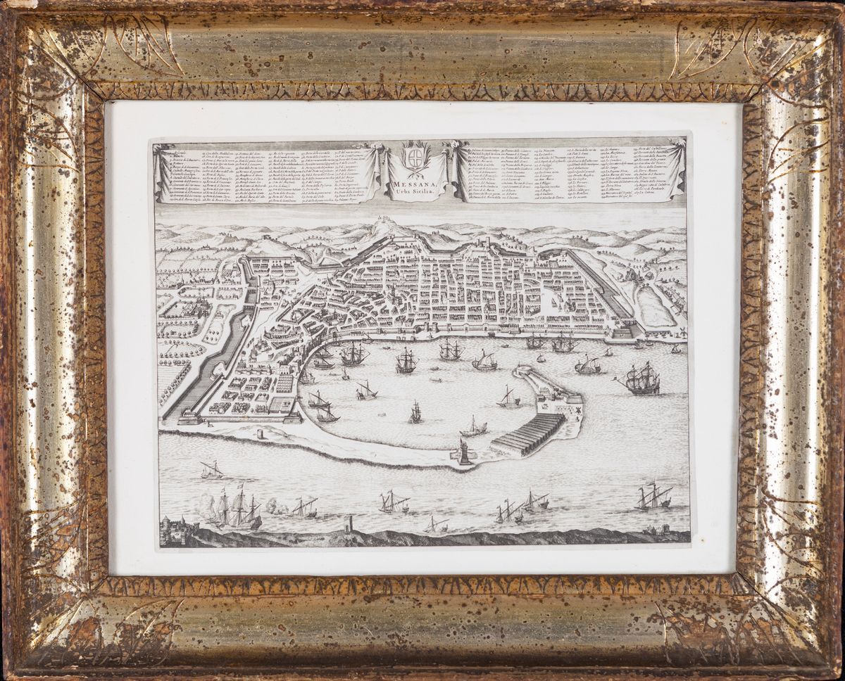 con fascia concava decorata da motivi angolari incisi; all'interno riproduzioni della pianta topografica della città di Messina con il porto dell'olandese Pieter van der AA e il Regno di Sicilia di Giovanni Antonio Magini