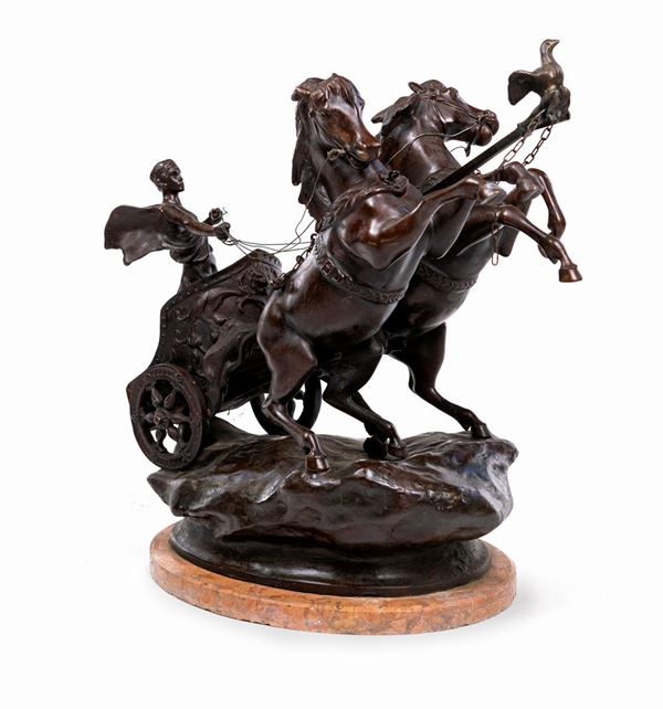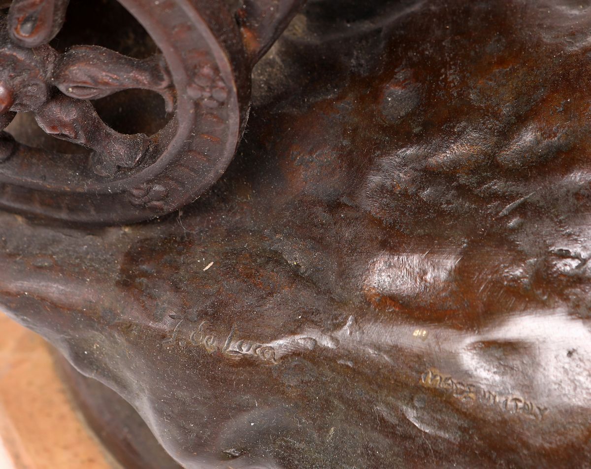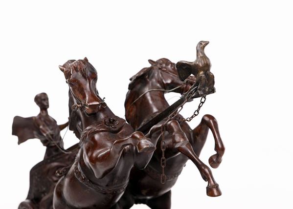 con cavalli rampanti su base rocciosa; basso supporto ovale in marmo. Reca firma F. De Luca Made in Italy sul retro della base