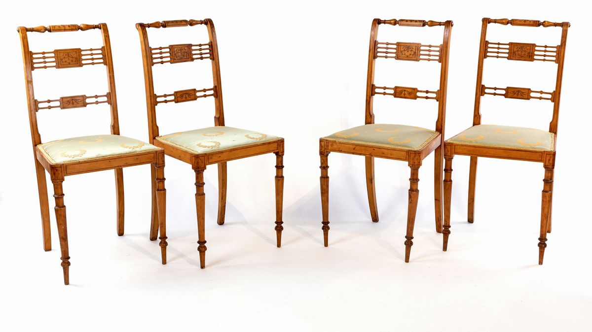 decorati ad intarsio in forma di composizioni naturalistiche sorrette da nastri svolazzanti; schienali a giorno, sedili imbottiti, gambe anteriori rastremate, posteriori sfuggenti