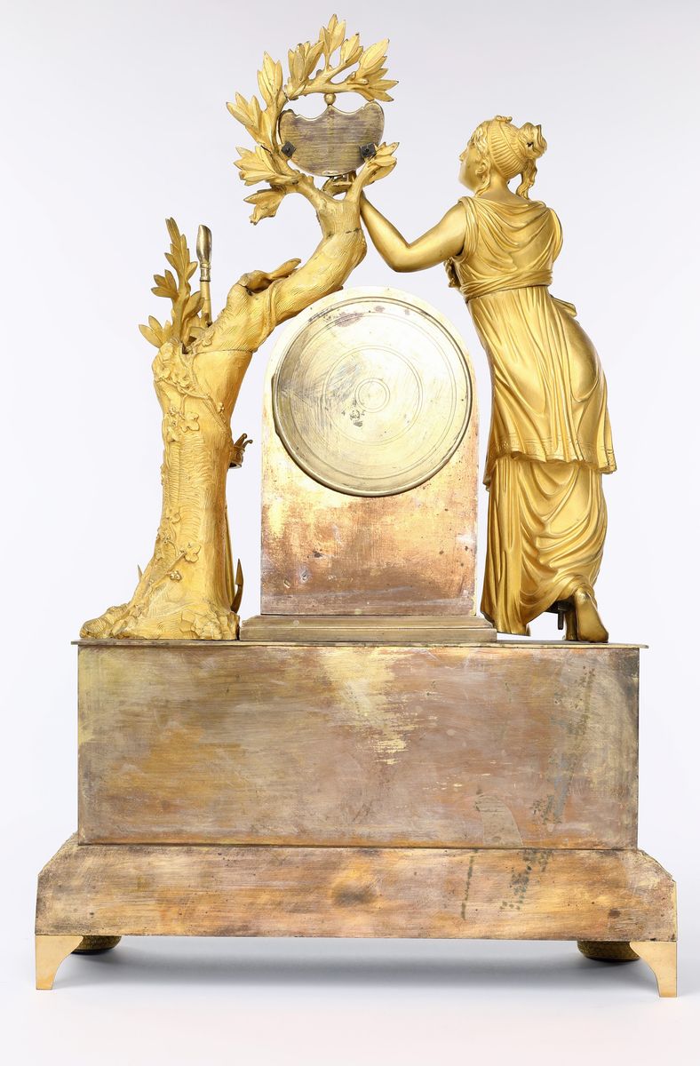 con cassa a forma di stele affiancata da una figura femminile rappresentante l'Innocenza, e da un tronco d'albero su cui si posa un'àncora quale simbolo di speranza; quadrante a due fori di carica con fascia oraria a numeri romani su anello in smalto bianco; alto basamento decorato in bassorilievo da rappresentazione allegorica con figura di Crono che trascina una giovane su una barca trainata da tritoni che soffiano entro lunghi corni, con guerriero e due figure femminili rispettivamente con cornucopia e specchio. Piedi a sfera, posteriori a mensola