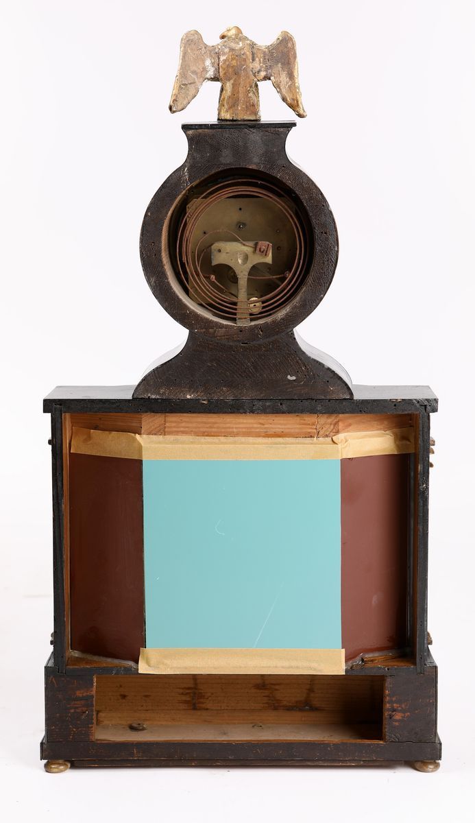 con struttura di impostazione architettonica e quadrante circolare in smalto bianco a numeri romani dominato da timpano con figura scultorea di rapace in legno dorato