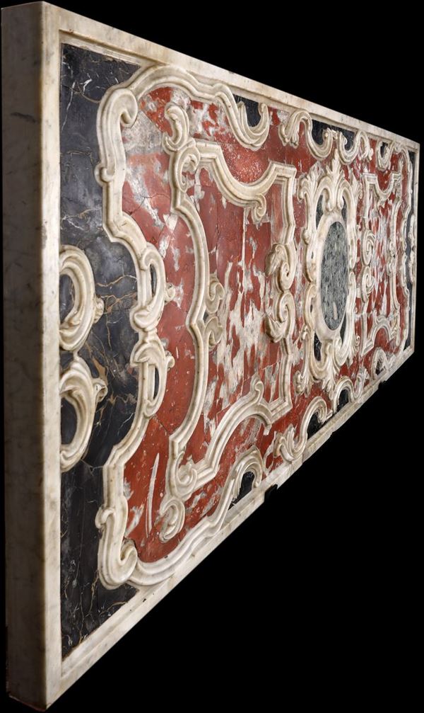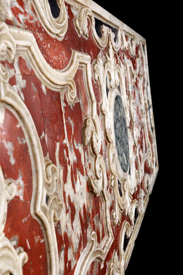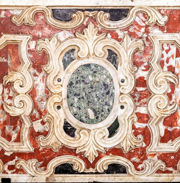 caratterizzato da cornici modanate con estremità a ricciolo poste a creare formelle sagomate su lastre di rosso antico; al centro ovale in breccia verde incorniciato da volute contrapposte e lungo il perimetro inserti in marmo portoro