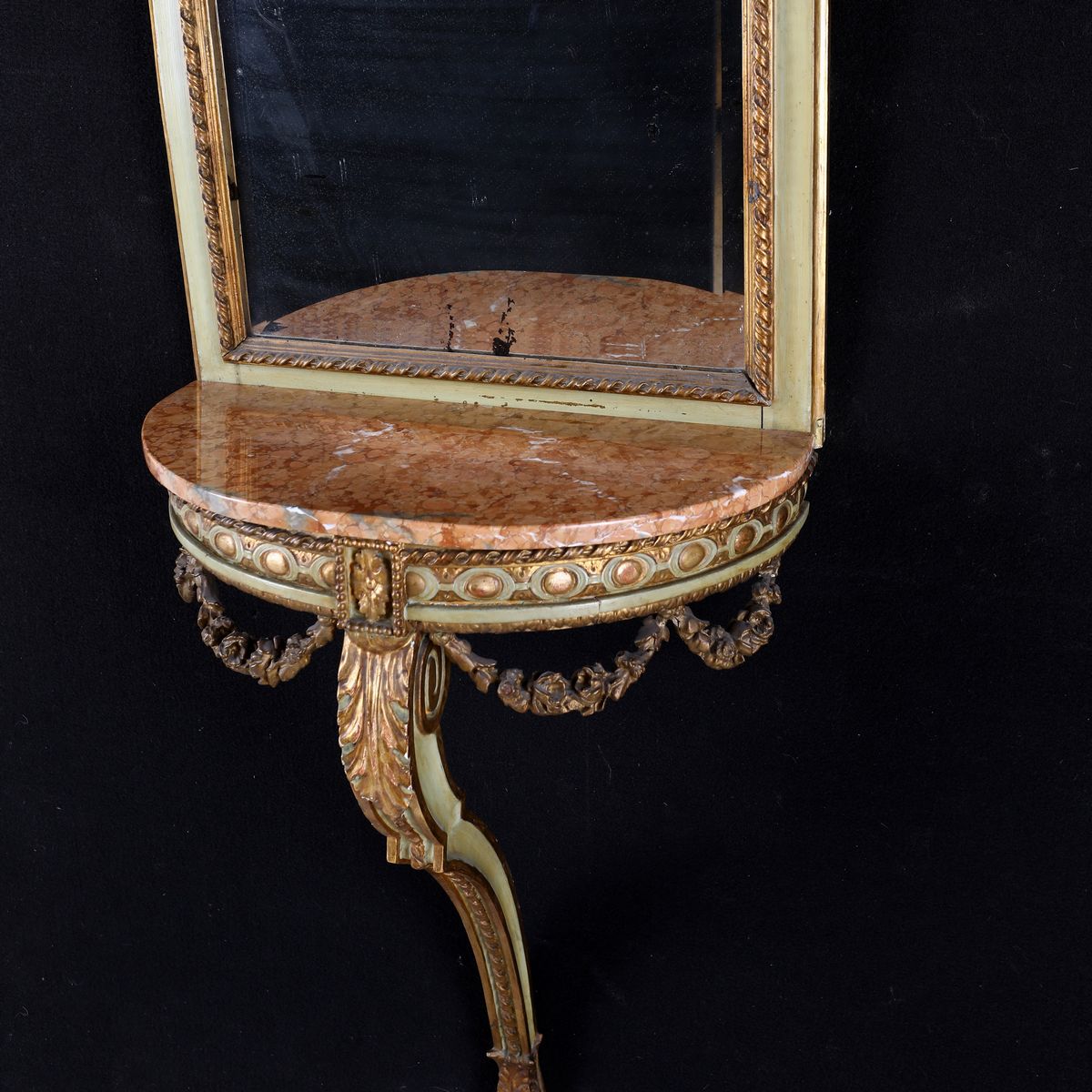 Piccola console d'applique in legno laccato e dorato con specchiera, inizi del XX secolo