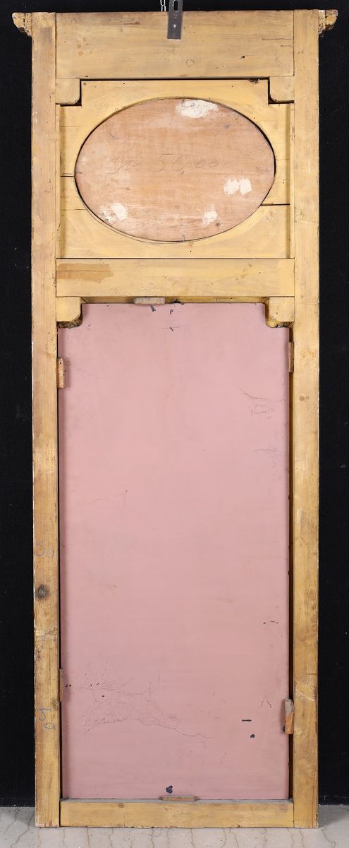 con piano a demi-lune in marmo e fascia percorsa da medaglioni ovali centrata da un rosone, sottolineata da ghirlande sospese minuziosamente intagliate che si dipartono dal montante centrale di linea sagomata intagliato a motivi vegetali. Unita ad una specchiera verticale con analoghe caratteristiche decorative, decorata nella parte superiore da una litografia raffigurante una scena romantica