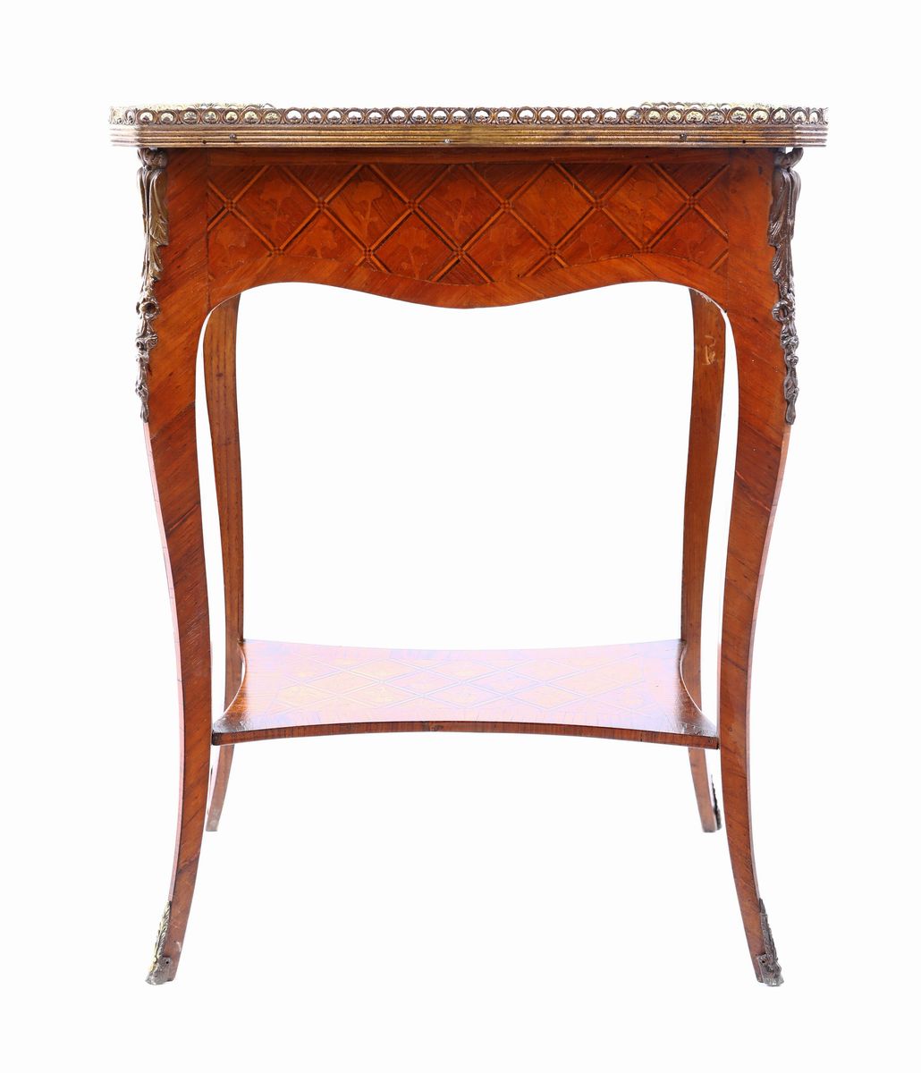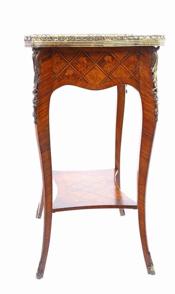 con piano rettangolare sagomato decorato da grillage intarsiato ad includere motivi floreali, racchiuso da ringhierina in bronzo dorato; un tiretto nella fascia, gambe sagomate riunite da un piano