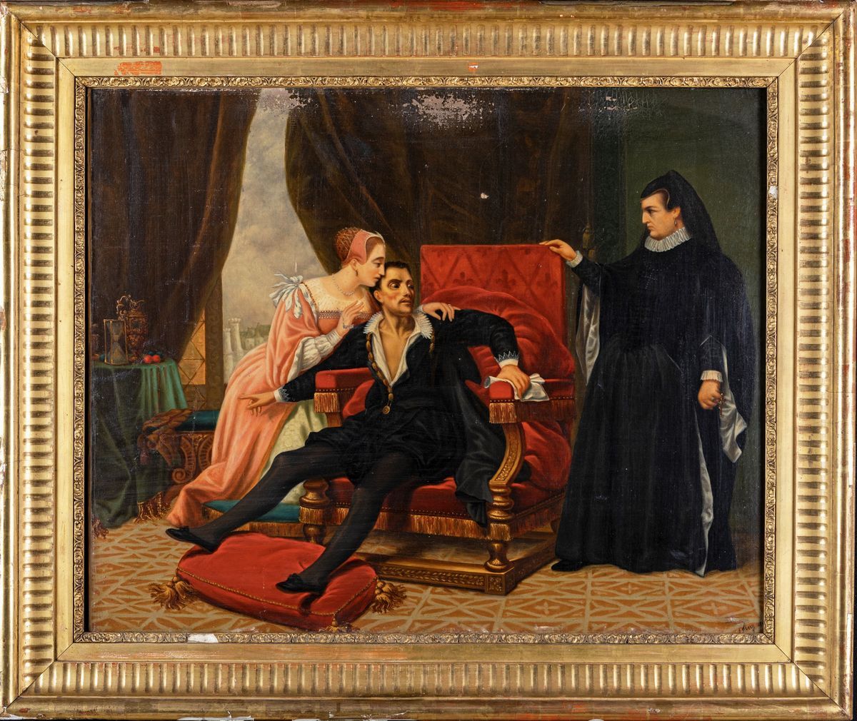 Allegra scenetta ambientata in un interno di abitazione borghese in cui un uomo, scoperto in atteggiamento particolarmente amichevole con una ragazza, viene redarguito dalla moglie. Firmato e datato in basso a destra: A. Flory 18 ??.