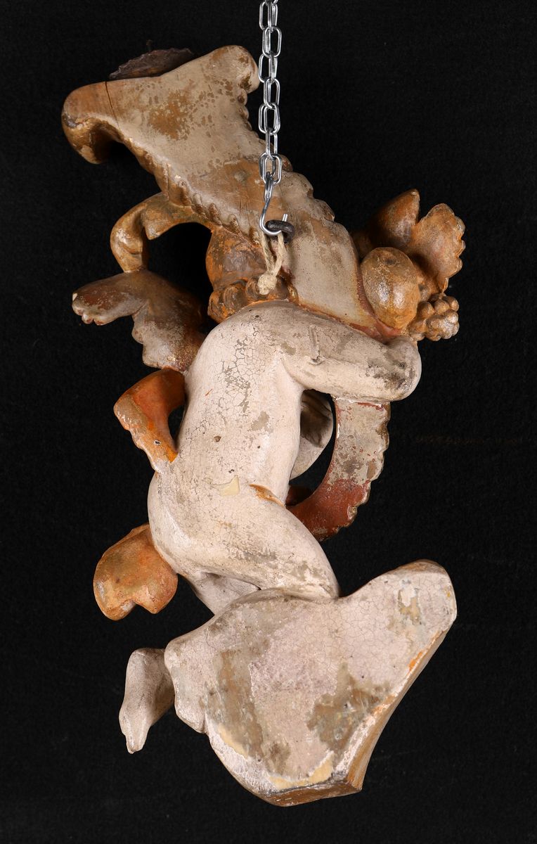 in forma di cornucopia sorretta da angelo inginocchiato su frammento di ricciolo architettonico