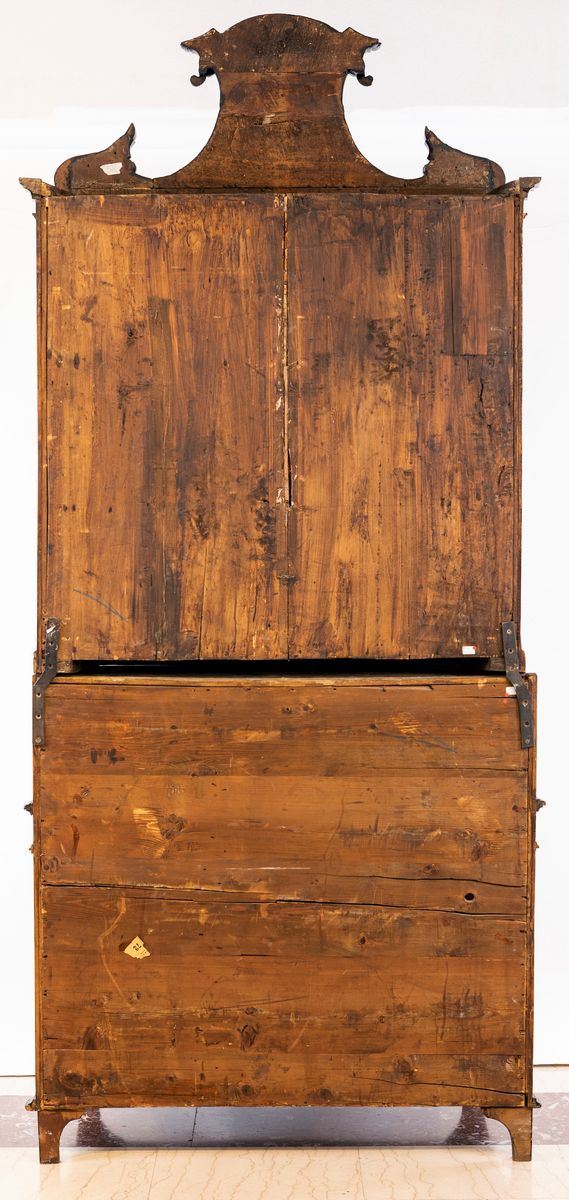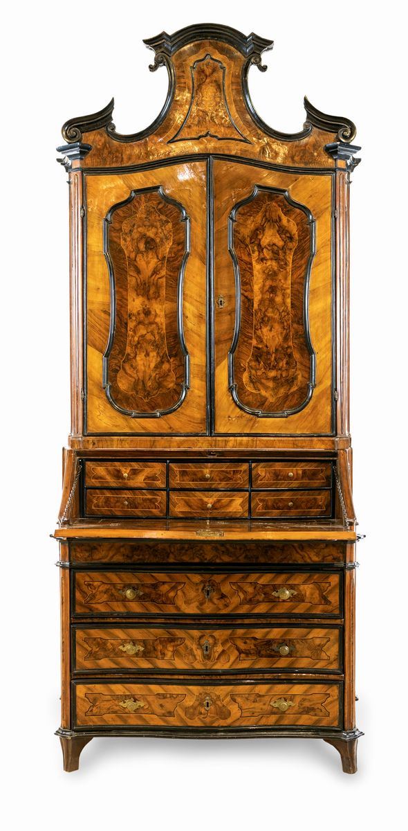 con cornici modanate in legno ebanizzato; corpo superiore con cimasa a timpano spezzato e due sportelli con ripiano interno; corpo inferiore a tre cassetti sormontati da anta a ribalta che cela sei tiretti interni e la porzione centrale del piano scorrevole. Piedi a pilastro