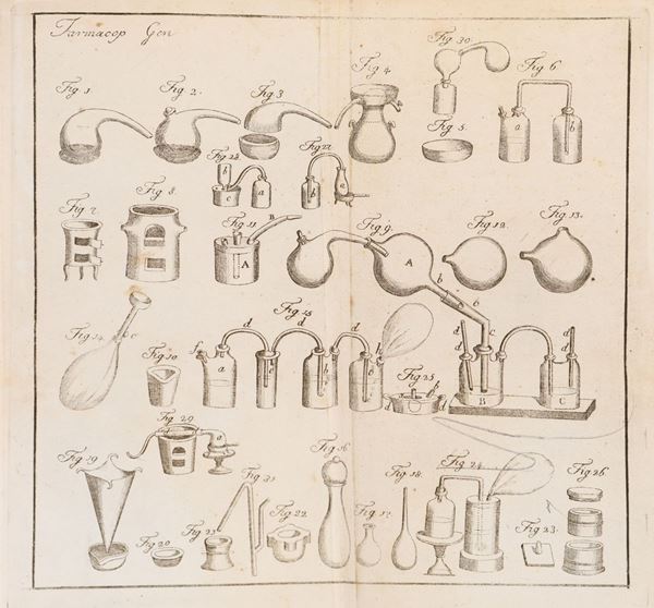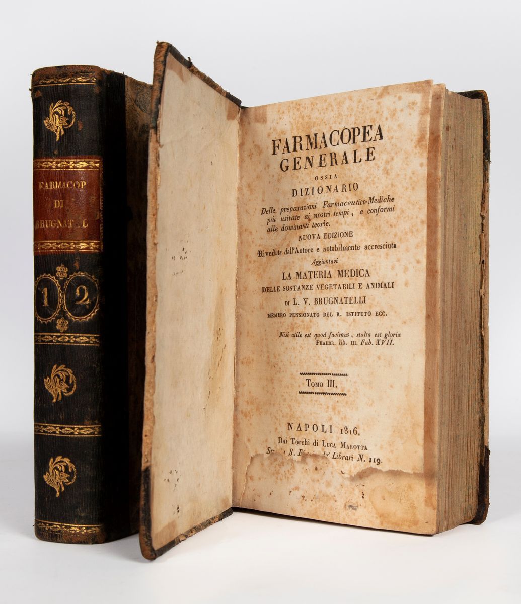 Mancante del ritratto in antiporta. Completo di incisioni all'interno. Nuova edizione in tre tomi, in due volumi con unito: "Brugnatelli Luigi Valentino, Materia medica vegetabile ed animale ossia Dizionario compendioso [...]. Per servire di compimento alla Farmacopea Generale. 2 Volumi in mezza pelle con titoli e fregi in oro al dorso.