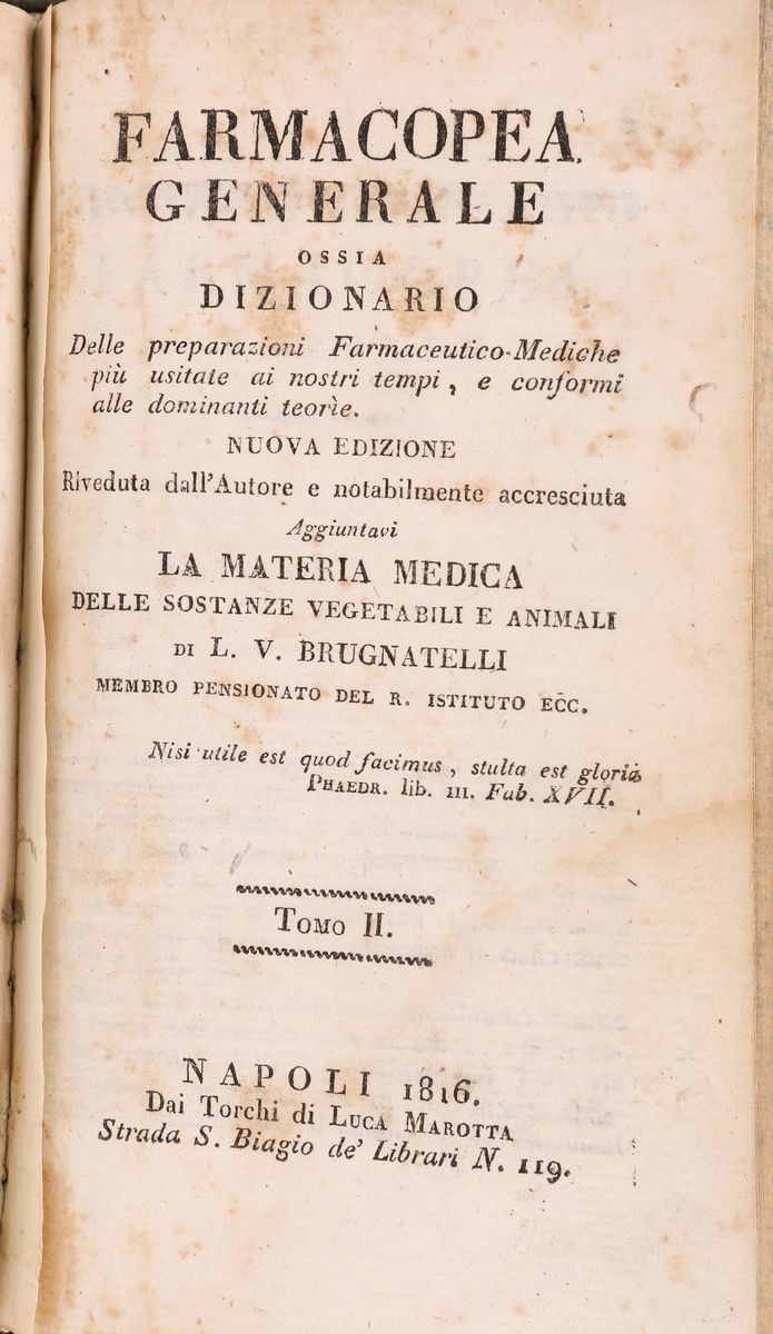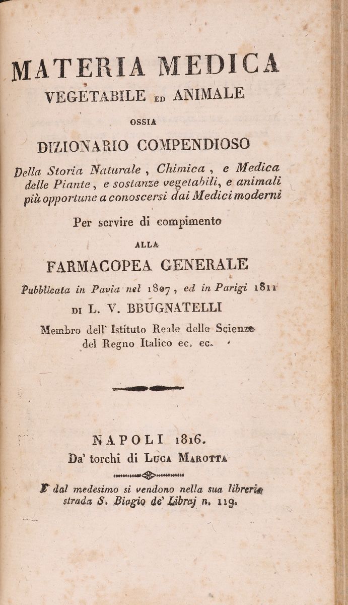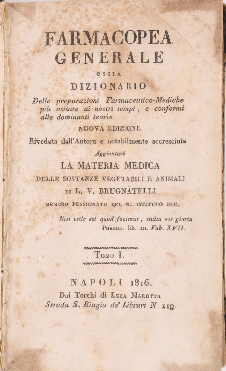 Brugnatelli Luigi Valentino, Farmacopea Generale ossia Dizionario delle preparazioni farmaceutico-mediche..., Luca Marotta, Napoli 1816