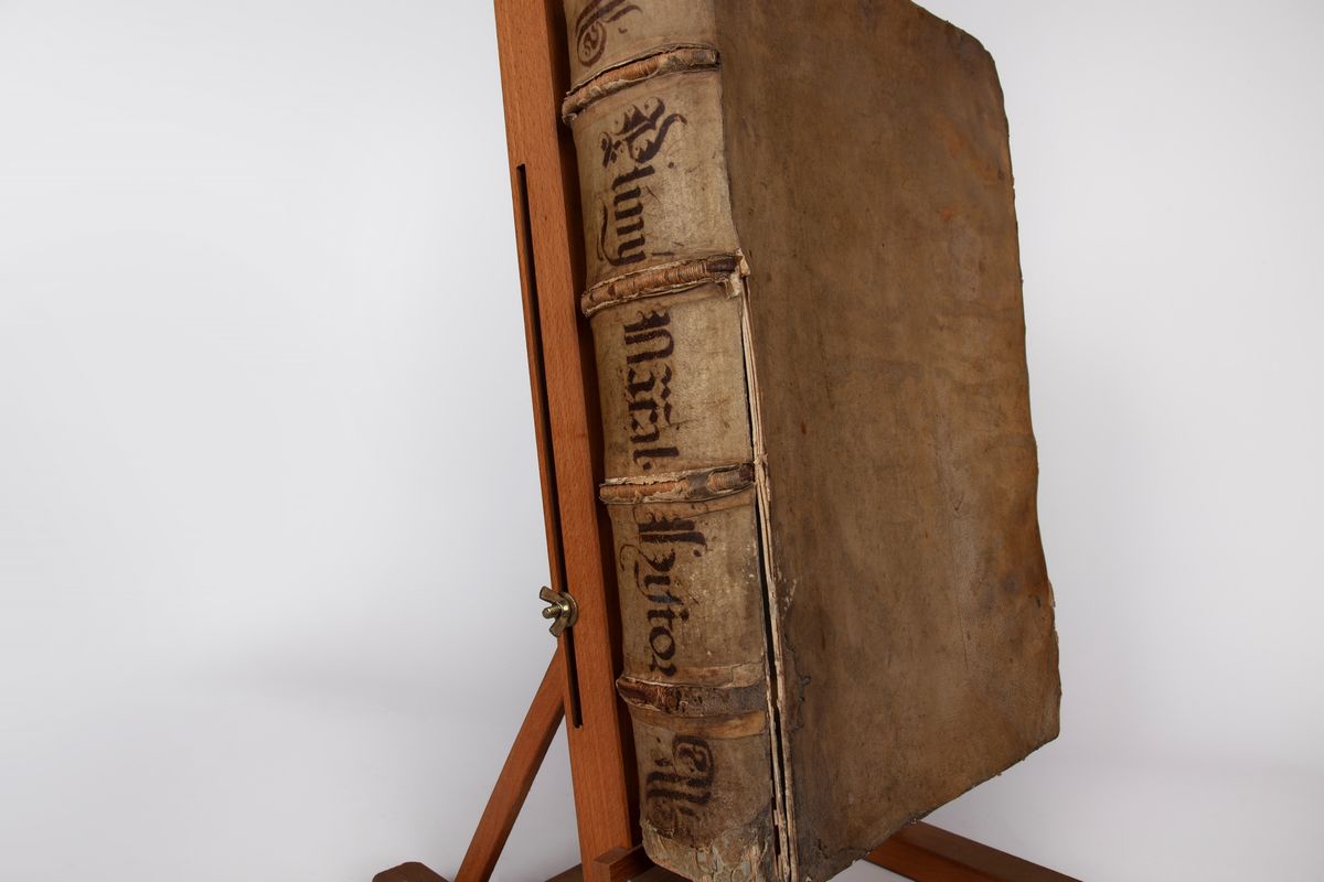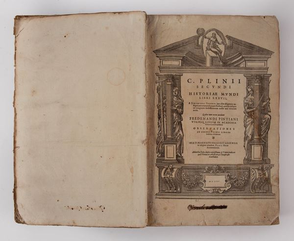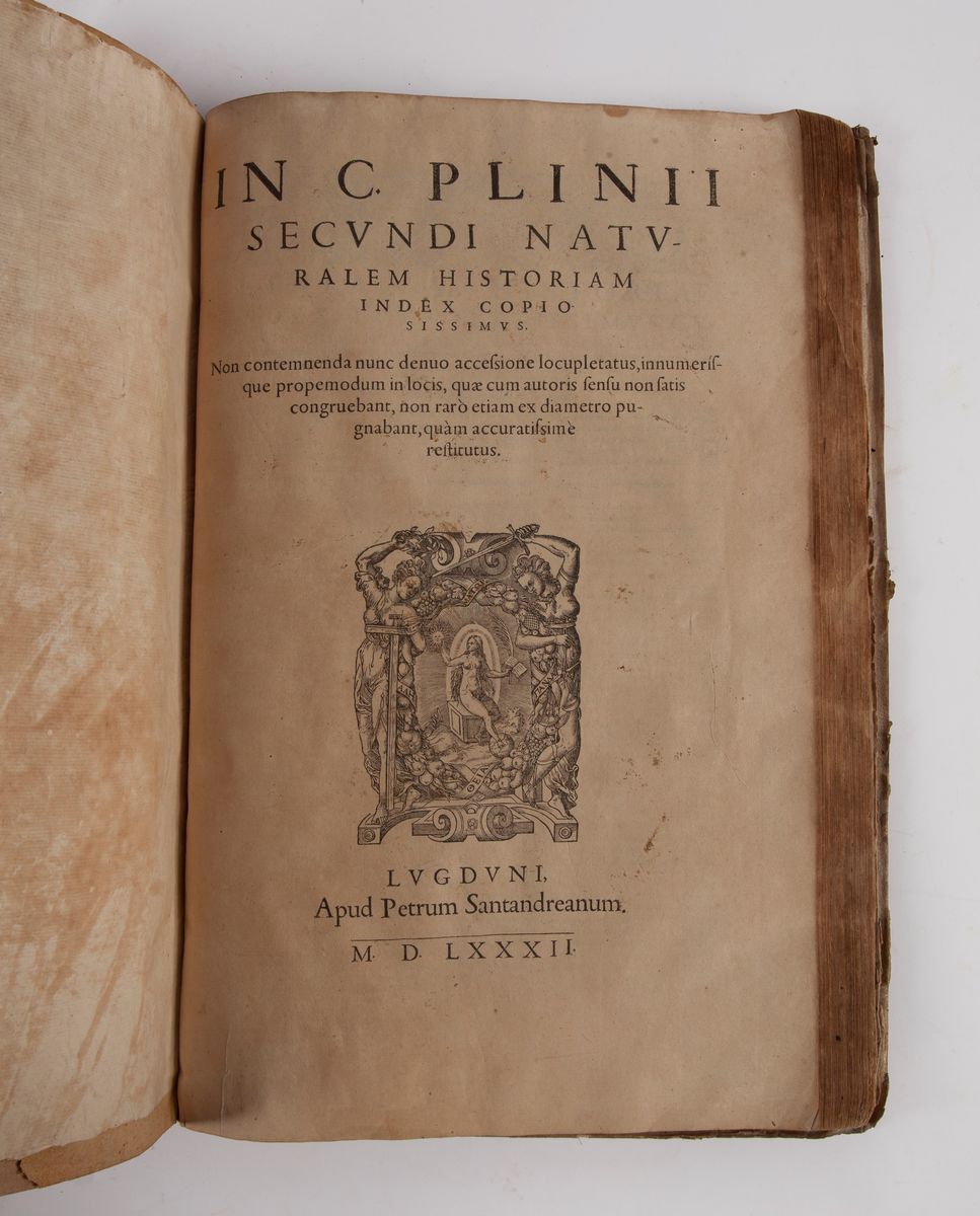 Legatura in piena pergamena originale con quattro nervi, con titolo manoscritto al dorso. Piatto anteriore slegato, frontespizio e pagine restaurate. Fioriture, bruniture, strappi, restauri. Difetti e mancanze. Unito: In C. Plinii Secundi Naturalem Historia, Index copiosissimus - Petrum Santandreanum, Lione, 1582.