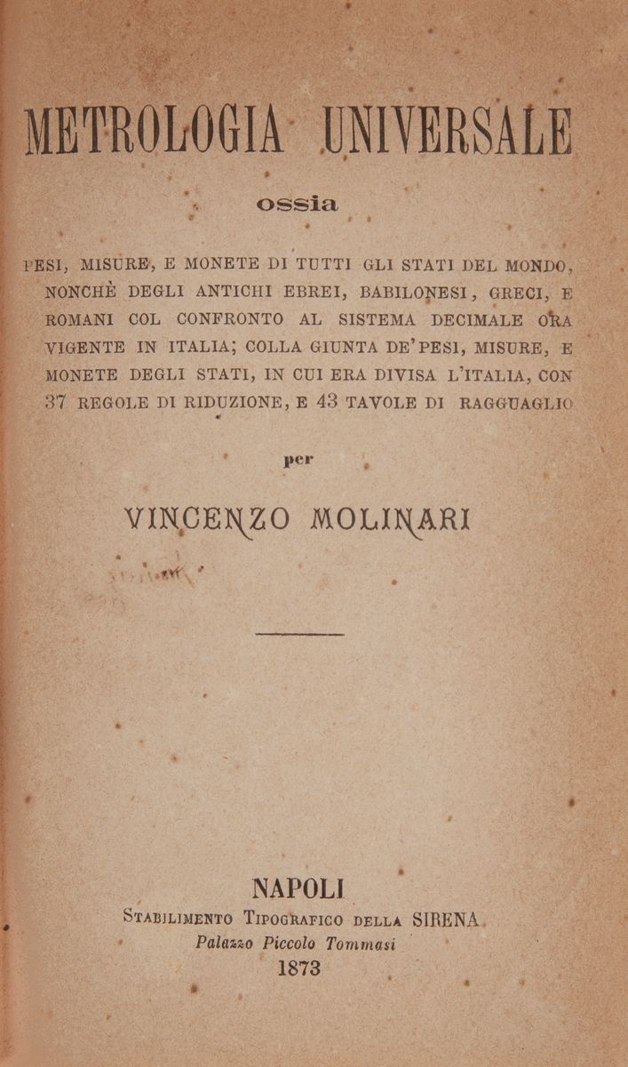 1- Vincenzo Molinari, Metrologia Universale; Stabilimento tipografico della Sirena, Napoli 1873 - legatura in tela con titoli e fregi in oro al dorso