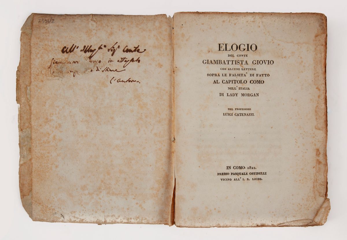 Luigi Catenazzi. Elogio del Conte Giambattista Giovio con alcune lettere sopra le falsità di fatto al capitolo Como nell'Italia di Lady Morgan, Pasquale Ostinelli, Como 1822