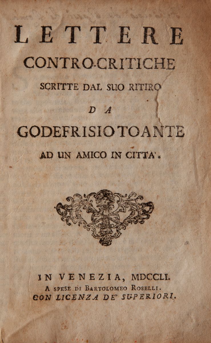 Pietro Chiari. Lettere contro-critiche scritte dal suo ritiro da Godefrisio Toante ad un amico in città, Bartolomeo Roselli, Venezia 1751