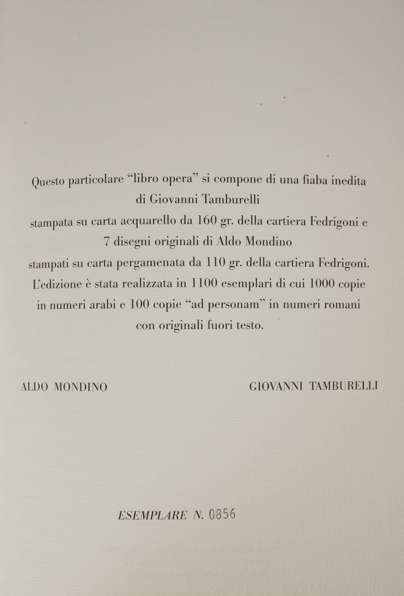 7 Disegni originali di Aldo Mondino realizzati per la fiaba inedita di Giovanni Tamburelli nel 1994 nelle campagne del Monferrato. "Libro d'opera" stampato su carta Fedrigoni in 1100 esemplari di cui 1000 in numeri arabi (ns. nr. 0856). Copertina disegnata, illustrata a colori entro astuccio di cartone originale.