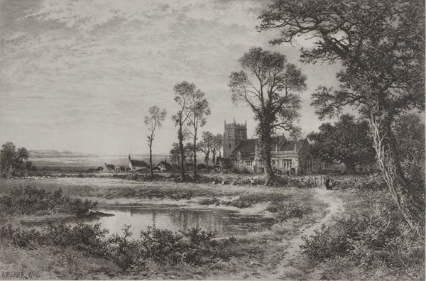 Paesaggio con figure armenti presso uno stagno con chiesa e casolari sullo sfondo, 1902