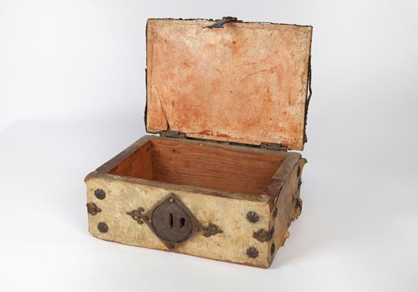 di forma rettangolare con profili in metallo, rosoni angolari e serratura in bronzo. Difetti
