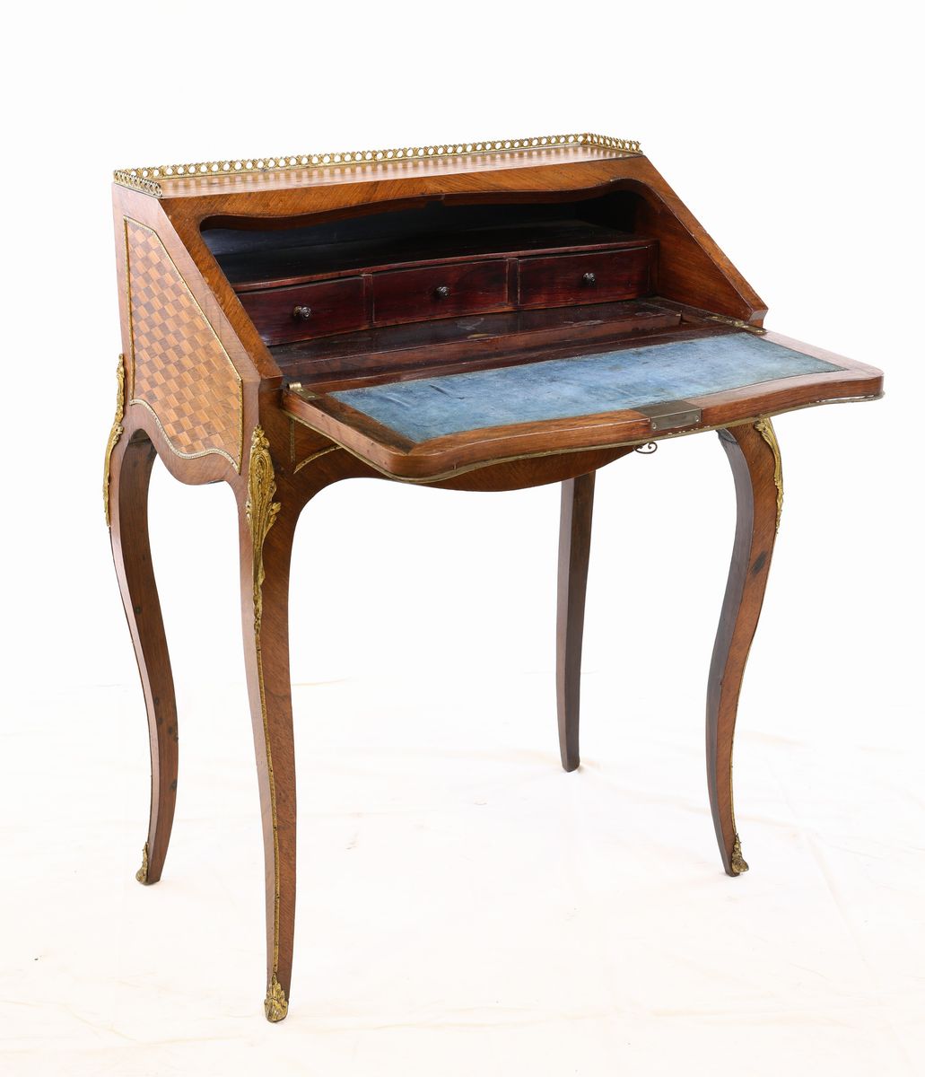 intarsiato a marqueterie geometrica con finiture ornamentali in bronzo dorato; poggiante su gambe sagomate, la ribalta reca al verso rivestimento in velluto e cela un ripiano con tre tiretti allineati e la porzione centrale del piano scorrevole con ampio vano interno
