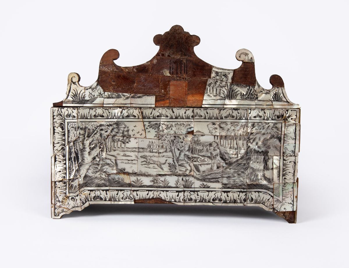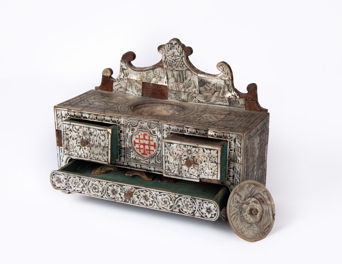 Calamaio in legno rivestito da placchette in madreperla con croce di Gerusalemme, metà del XIX secolo