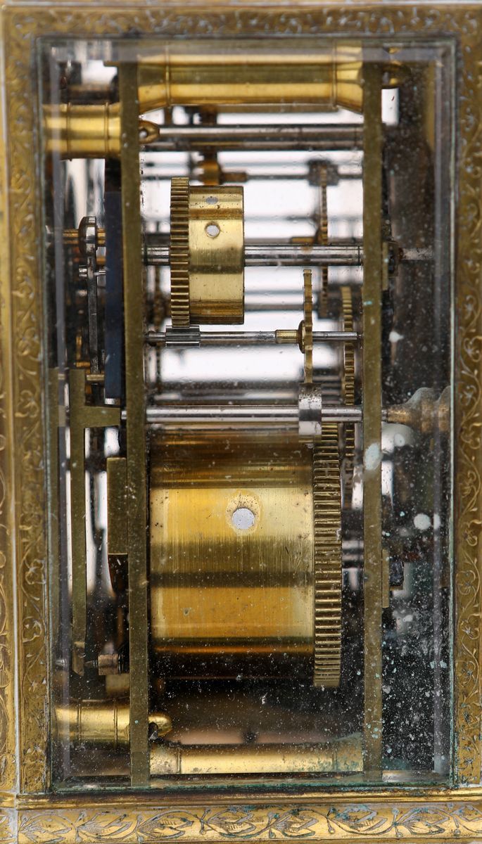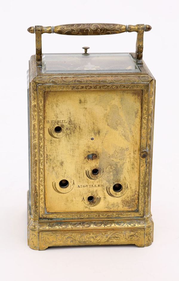 con cristallo su i quattro lati e nella parte superiore; quadrante a numeri romani; chiave di carica custodita all'interno. Firmato sul quadrante: J. F. Bautte & Cie à Geneve