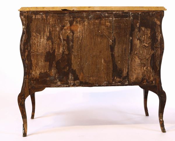 corpo sagomato caratterizzato da specchiature impiallacciate a fibre contrapposte racchiuse da bordure a spina di pesce entro filettature lineari; piano sagomato in marmo giallo, due cassetti frontali con bocchette e maniglie in bronzo, gambe mosse. Difetti