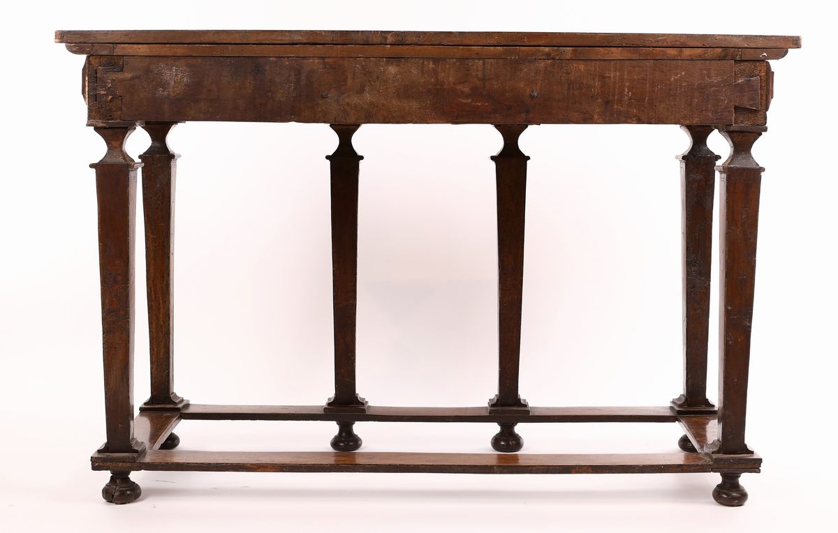 piano rettangolare scandito da tre riquadri, corrispondenti ai tre cassetti allineati compresi nella fascia, separati da formelle bugnate; gambe rastremate poggianti su traverse; bassi piedi a trottola