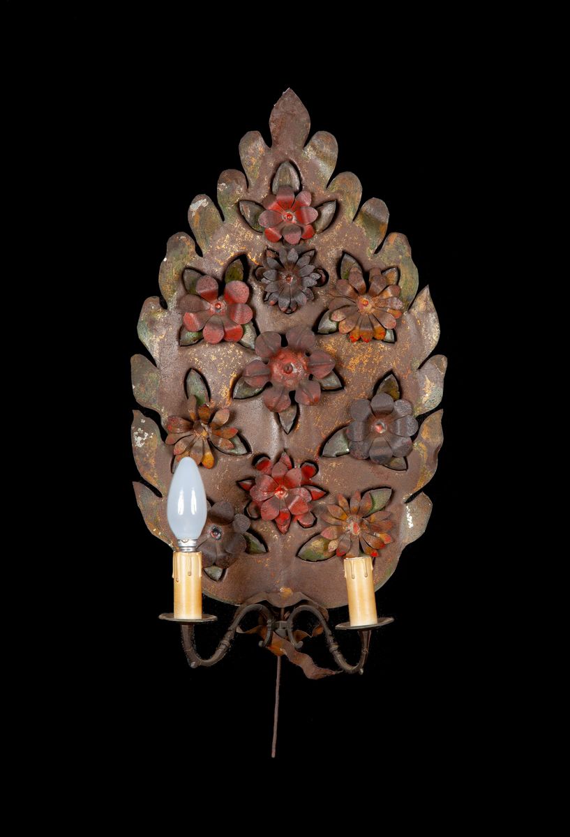 con supporto parietale sagomato a forma di foglia su cui emergono corolle policrome rese in rilievo