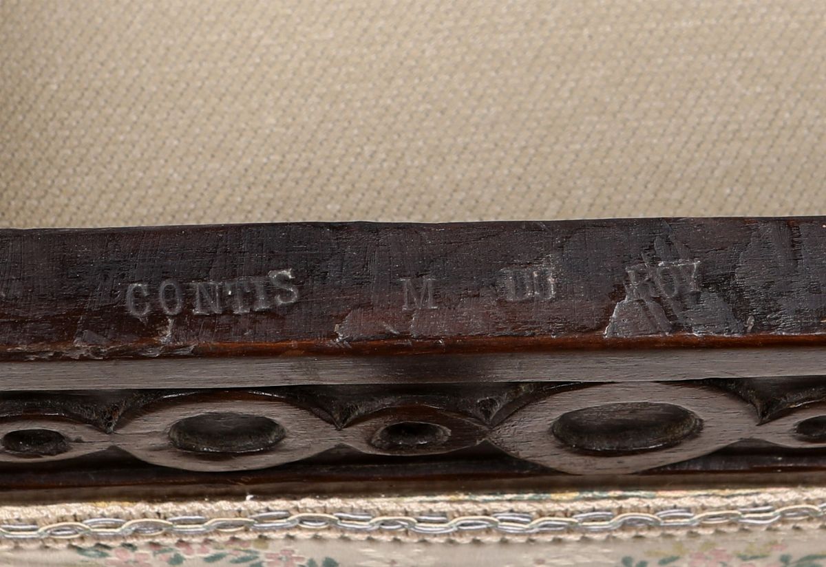 con cornici intagliate percorse da motivi guilloché; schienali a giorno, sedili imbottiti, gambe rastremate e scanalate. Recano stampiglia sotto sedile: Contis M. du Roy