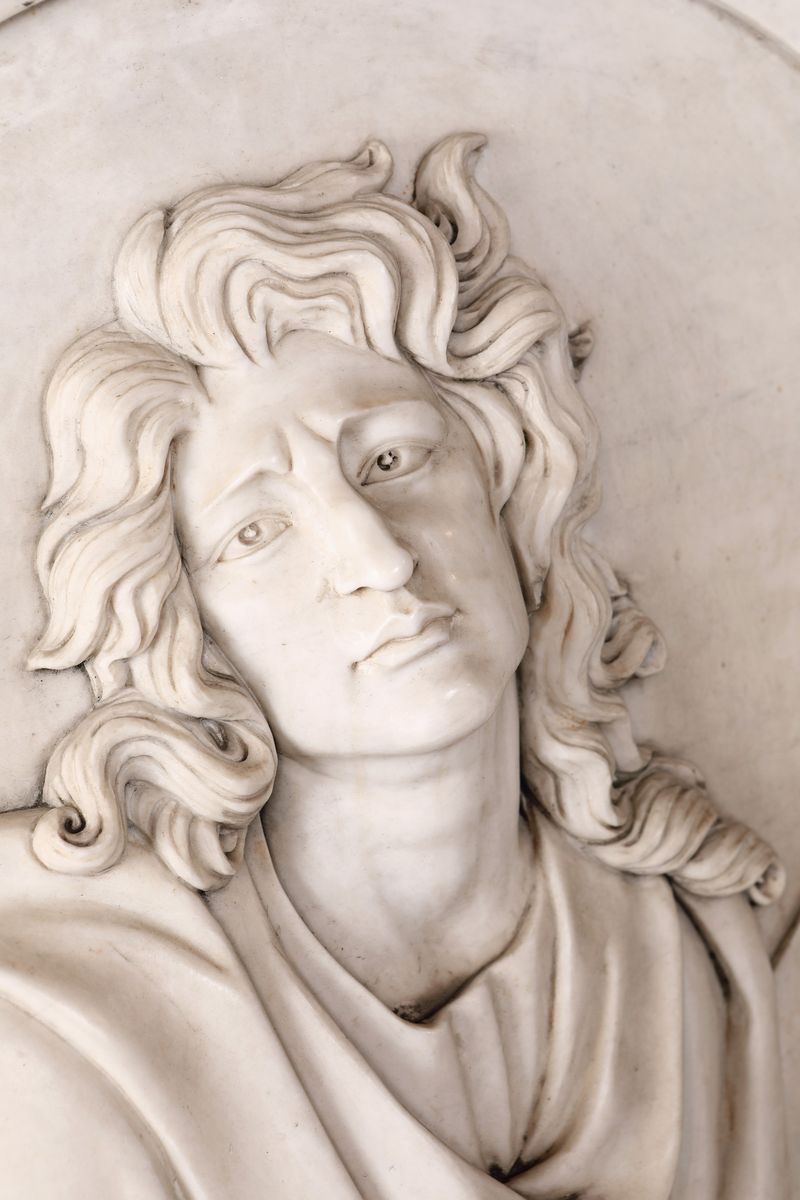 con figura a mezzo busto di San Giovanni apostolo, scolpita in altorilievo secondo l'iconografia classica con l'aquila, una penna per scrivere e un rotolo di pergamena
