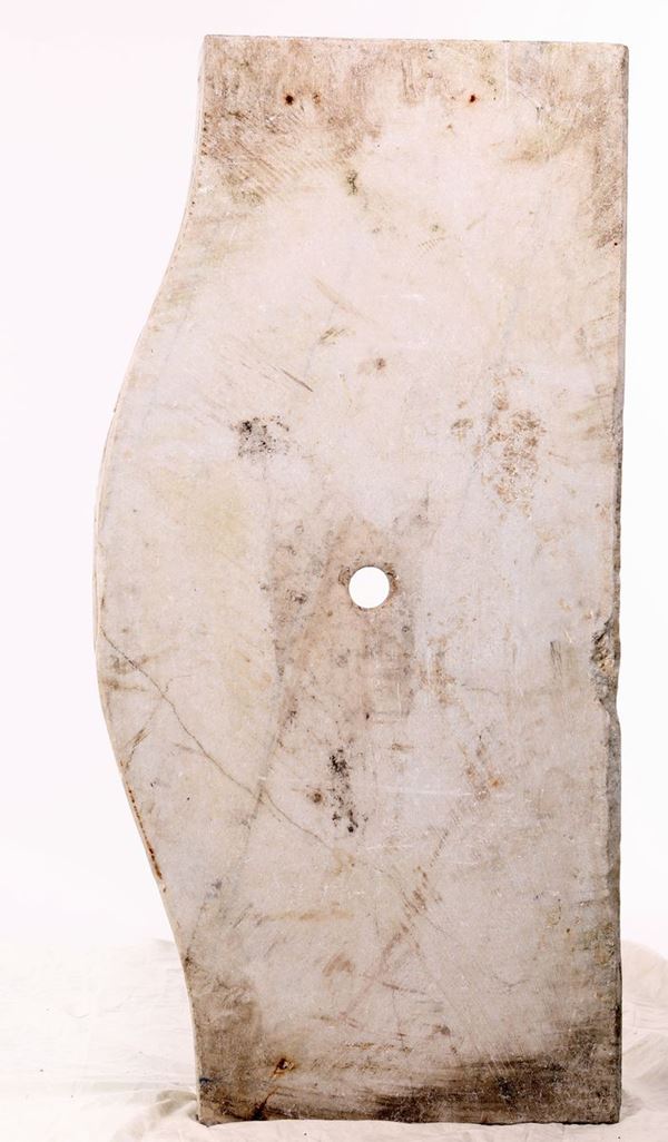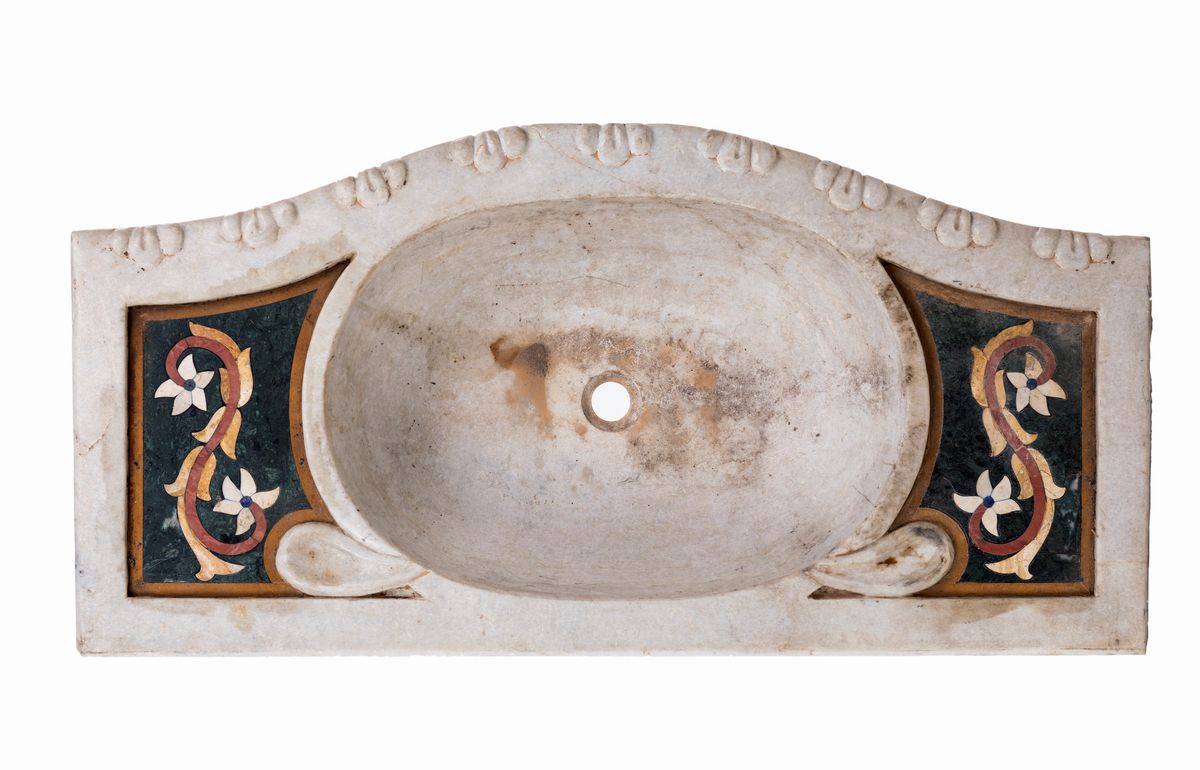 di forma rettangolare con fascia di linea convessa decorata da girali con corolle in bassorilievo, vasca ovale affiancata da tabelle in marmo nero con intarsi naturalistici